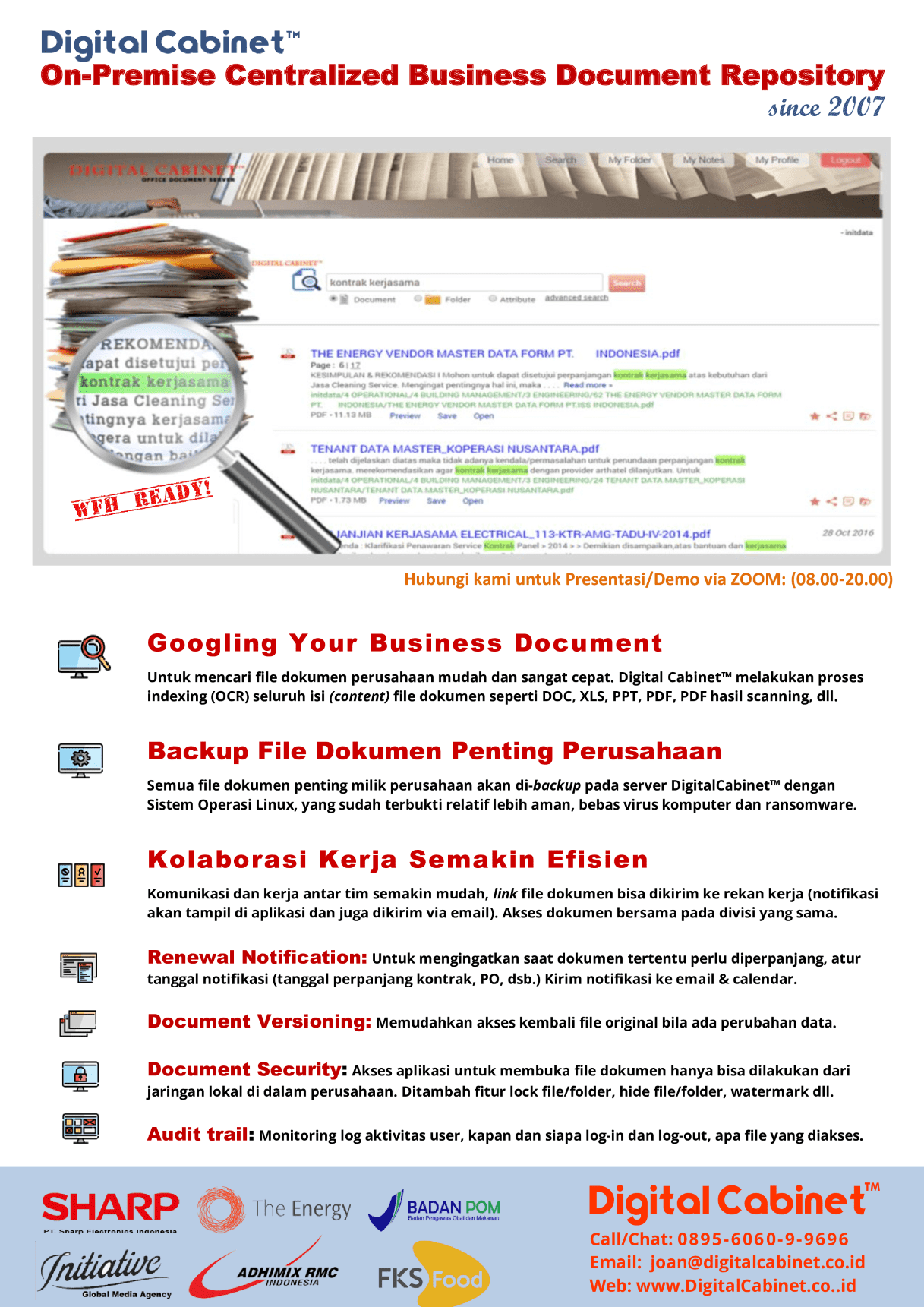Bila perusahaan Anda ingin mendapatkan informasi lengkap atau menginginkan proposal penawaran (pricelist), hubungi kami hari ini. Untuk mendapat presentasi langsung dan akses demo aplikasi DigitalCabinet™, kami menyediakan waktu untuk berdiskusi via ZOOM setiap hari (Senin-Minggu). Silakan hubungi kami sekarang di