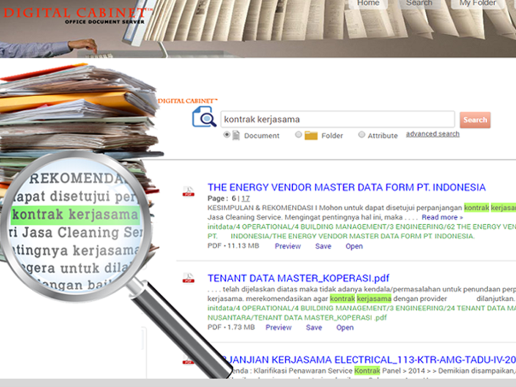 Mencari file dokumen dengan keyword apapun sesuai isi konten dokumen. Lebih akurat, mudah dan cepat.