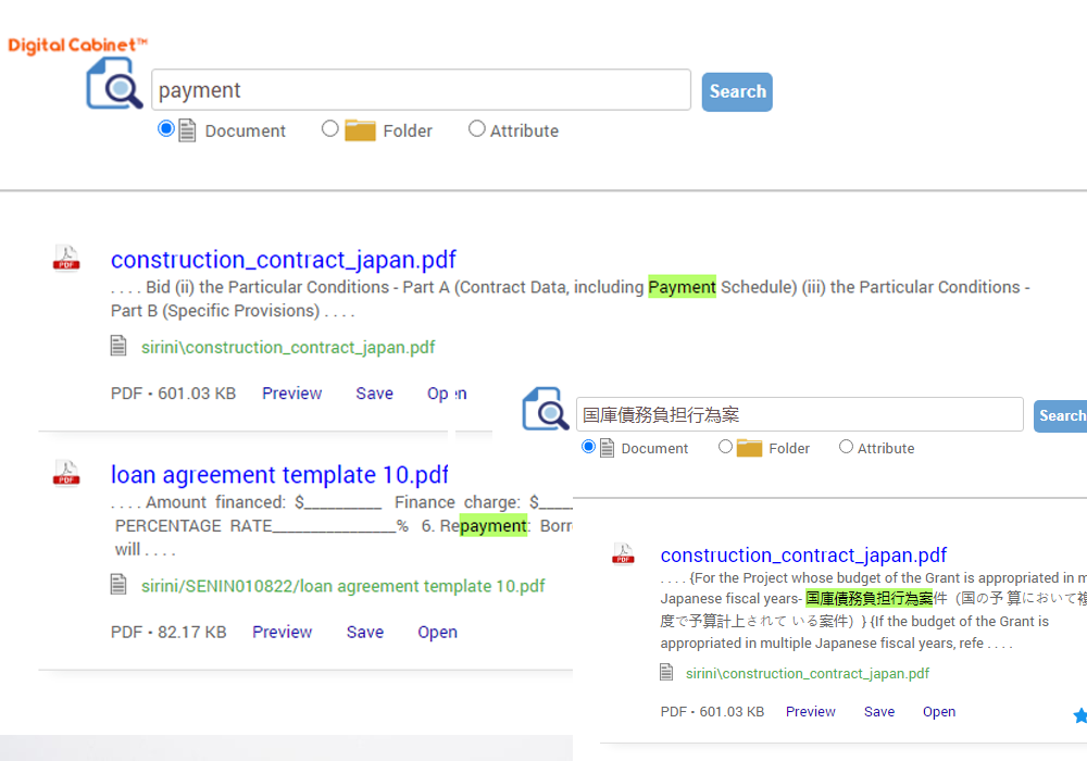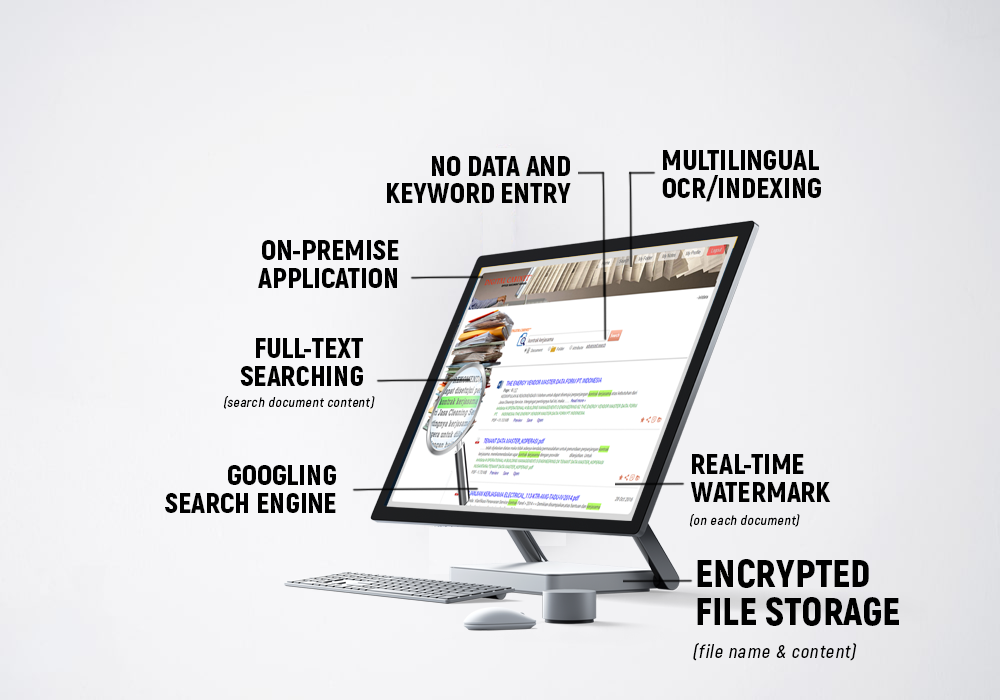 Searching file dengan keyword dari isi konten dokumen, tidak perlu entri data. Mencari dokumen dalam lebih dari 25 alphabet (japan, korean, mandarin, english, indonesian, arabic dll). Setiap dokumen yang dibuka tertera watermark logo perusahaan, username dan jam, menit, detik akses.